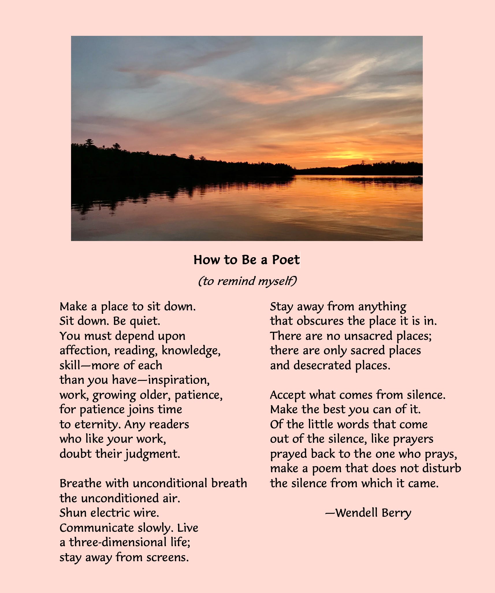 I hope to spend part of my sabbatical in a place where I can rest at the edge of the woods and eavesdrop on the ancient conversation between those old friends, the lake and the land. I’m eager to follow Wendell Berry’s advice to “Sit down. Be quiet.”, as offered in a poem that might as well be titled, “How to Be a Human.” And I look forward to returning to this online community which I’ve come to value a great deal, despite its dependence on “wires and screens!”