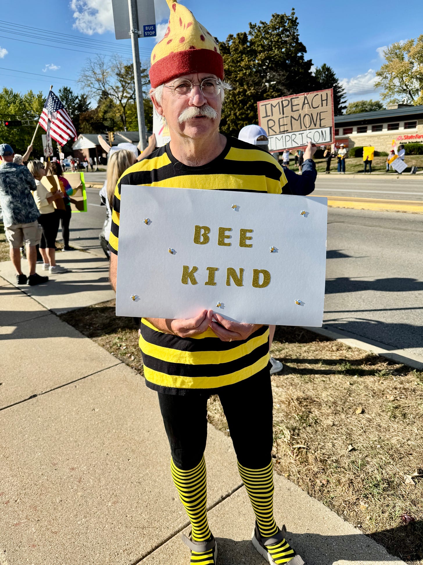I. We talked about going to Chicago where I was born, or to downtown Madison where we live, but mobility issues kept my wife and me from attending one of the larger No Kings rallies. So on Saturday, Oct. 18, we drove a few miles to join the protest in Middleton, a town of 20,000 or so whose motto is “The Good Neighbor Community”—a town whose claim to fame is the National Mustard Museum.